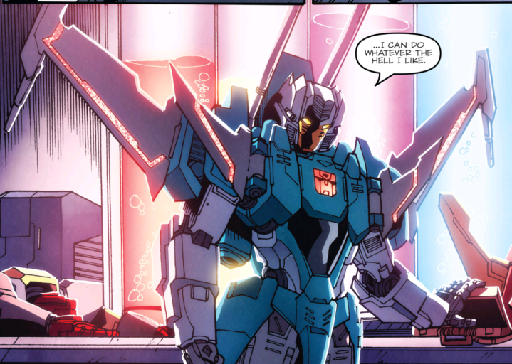 It’s true that putting the war to bed has opened up a huge number of new storytelling avenues, most of them predicated on the idea that, once (overt) hostilities cease, and the red and purple badges are put to one side, you’re forced to see each Autobot and Decepticon as a Cybertronian – as a character defined by something other than who they used to take orders from. As I say, it’s opened up lots of new story possibilities. All that said, if the war started again – and it well might – that would mean MTMTE had to end. It would just create some interesting new tensions…